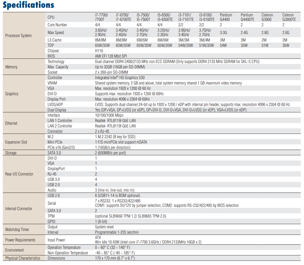 适配Intel® 第6/7代 Core™ i 处理器,搭载H110芯片组。高性价比,拥有丰富的扩展接口,稳定可靠。